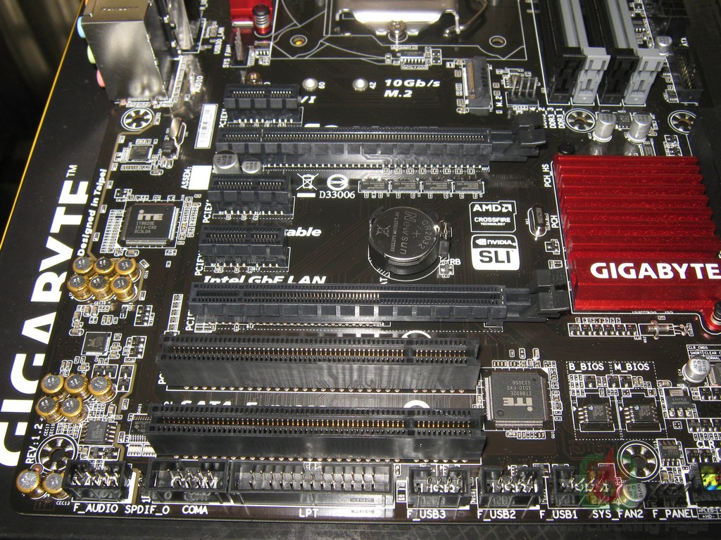 … E para a GA-Z97X-SLI, a GIGABYTE optou por um pcb “quase preto” e dissipadores vermelhos. Sobre o layout da placa, é algo bem pensado e não apresenta nenhuma falha grave no que diz respeito ao posicionamento dos componentes. Não existem botões on/off e reset na placa mas também nenhum outro concorrente de mesma faixa de preço oferece esse recurso, então podemos dizer que é compreensível sua falta.