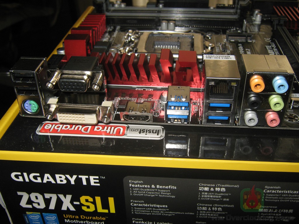 No painel traseiro, a GA-Z97X-SLI oferece 6 USB’s (sendo 4 USB 3.0 e 2 USB 2.0),  saídas de vídeo em diferentes padrões (o que garante que é possível usar desde um velho monitor CRT ou até mesmo uma moderna TV LCD  em conjunto com o IGP), 1x LAN Gigabit e painel de som completo (6 jacks).