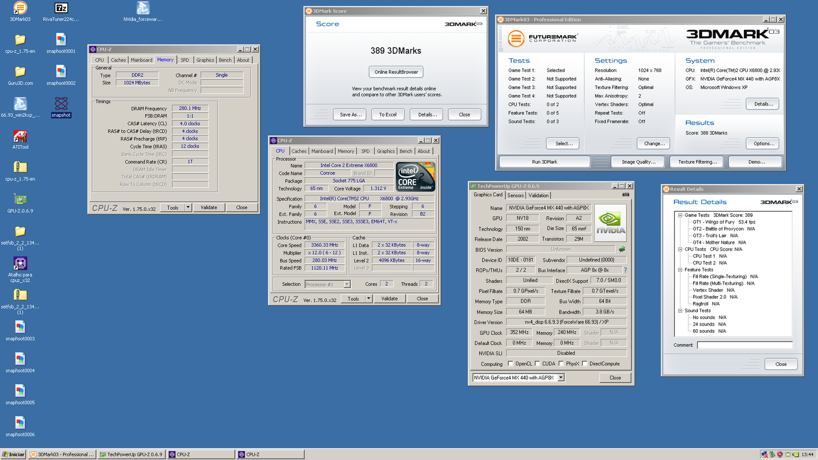 Começando com a VGA rodando ainda no ar e nesse ponto a única modificação que havia sido feita na placa eram os ramsinks e desse modo, foi possível atingir 352MHz no GPU e 240MHz nas memórias com uma pontuação de 389 marks no 3dmark03, conforme pode ser visto abaixo:
