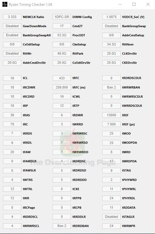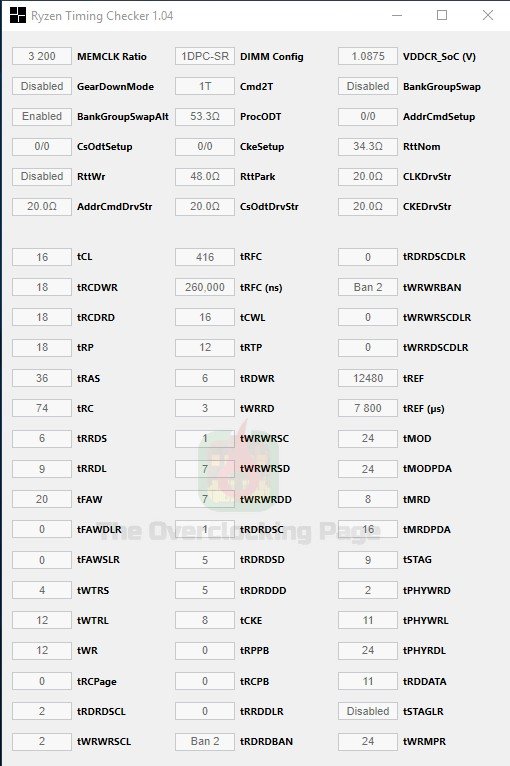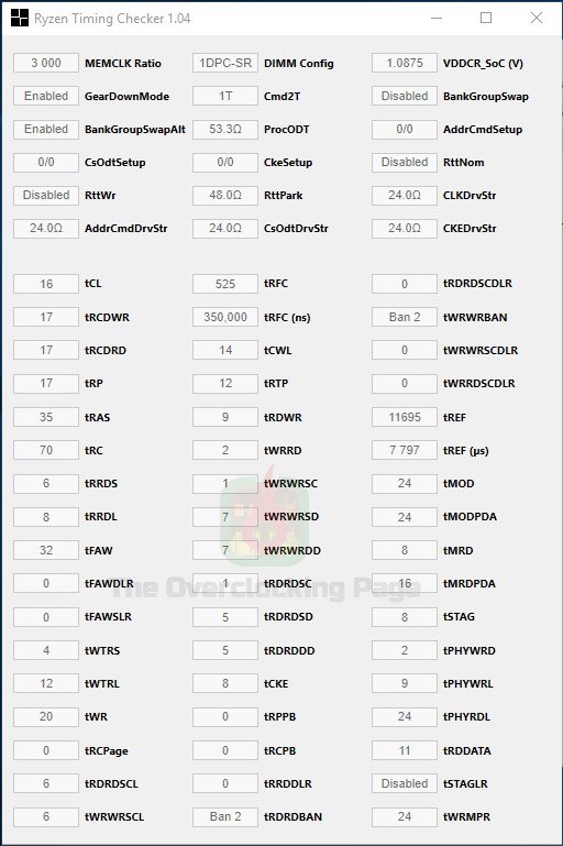 Trabalhando com esse perfil “híbrido”, ainda foi possível apertar o tRDRDSCL e tWRWRSCL para 2 e também desabilitar o GearDown Mode, efetivamente colocando as memórias para trabalharem com Command Rate em 1T, sendo necessário apenas um pequeno incremento no VDIMM de 1.35V para 1.375V para se obter estabilidade com esse ajuste. Abaixo o screenshot do Ryzen Timing Checker referente a essa configuração: