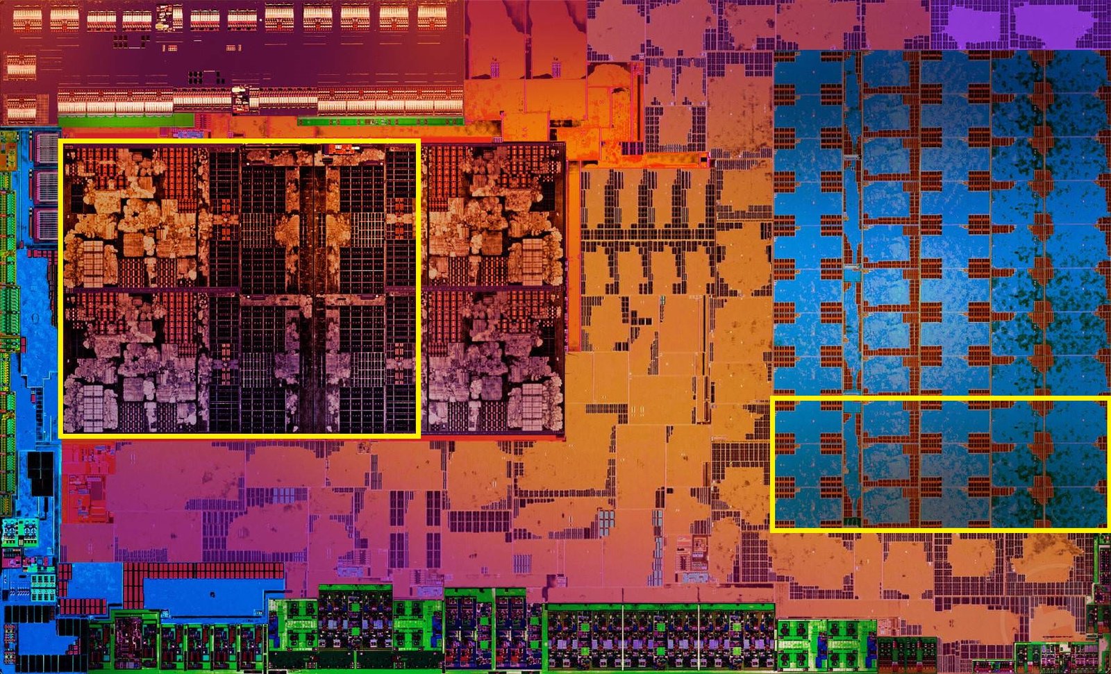 No die shot abaixo, está circulado em amarelo as partes da CCX e do GPU que estão ativadas no Athlon 200GE, para maiores detalhes da arquitetura, sugiro a leitura do review das APUs Raven Ridge, onde trago maiores detalhes sobre esse ponto.