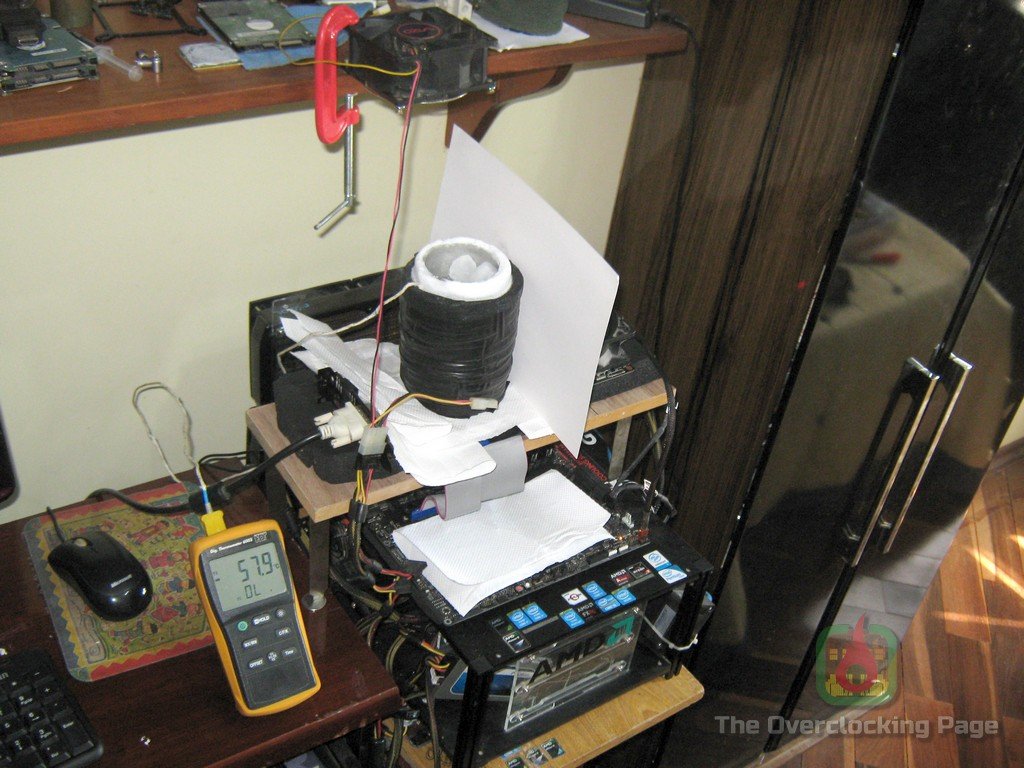 Para retirar a “fumaça” do gelo seco e evitar que o fan do VRM aspirasse a mesma, usei um pedaço de papel cartão e um Vizo Windstorm 92mm preso na prateleira usando um grampo sargento para aspirar isso e jogar para longe do hardware. Na galeria abaixo, as fotos de como ficou a bancada com tudo preparado.