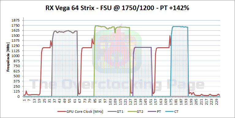 O resultado foi esse gráfico abaixo que trás o comportamento do GPU rodando FSU com P7 setado em 1750MHz 1125mV, HBM em 1200MHz 1000mV, com PT em insanos +142% e temperaturas sempre abaixo dos 0ºC seguindo o padrão descrito acima.