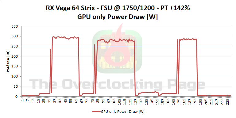 Para ilustrar melhor isso que foi dito, segue abaixo o gráfico do consumo do GPU, onde é possível ver claramente essa relação entre o consumo do GPU e a frequência de funcionamento, notem que a escala do eixo horizontal é idêntica e que a comparação “ponto a ponto” com o gráfico acima é válida.