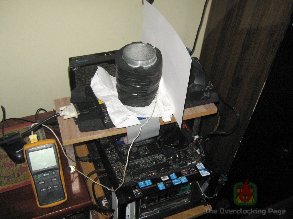 Após isso, desmontei a VGA e tratei de isolar a frente da mesma usando borracha limpa-tipo e nada na parte de trás, afinal de contas, usei um pedaço de neoprene entre a madeira da “mesa”, sendo isso suficiente para essa parte não fique em contato com o ar, impossibilitando a condensação. A pasta térmica utilizada foi a PCYes OCX Gelid, que ao menos na aparência e no papel, trata-se da mesma Gelid GC-Extreme “importada” e que no final das contas funcionou bem durante esse teste! ?
