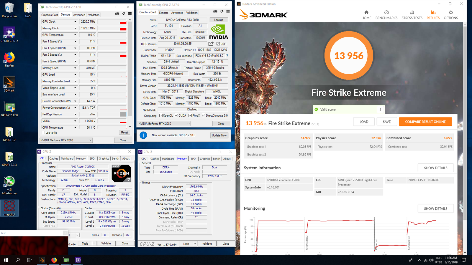 O primeiro benchmark que rodei logo após o termômetro chegar na casa dos -60ºC foi o 3DMark Fire Strike Extreme, com o objetivo de determinar o clock máximo que conseguiria completar o mesmo e assim cheguei aos 2220MHz no GPU, o que é uma boa marca para esse GPU rodando no gelo seco. Em relação a experiência com a RX Vega 64 Strix, a variação de temperatura entre o inicio e o fim de um dos testes do 3dmark foi menor por conta do tdp mais baixo do TU104 e que no caso, não vi a temperatura subir dos -50ºC em nenhum momento.