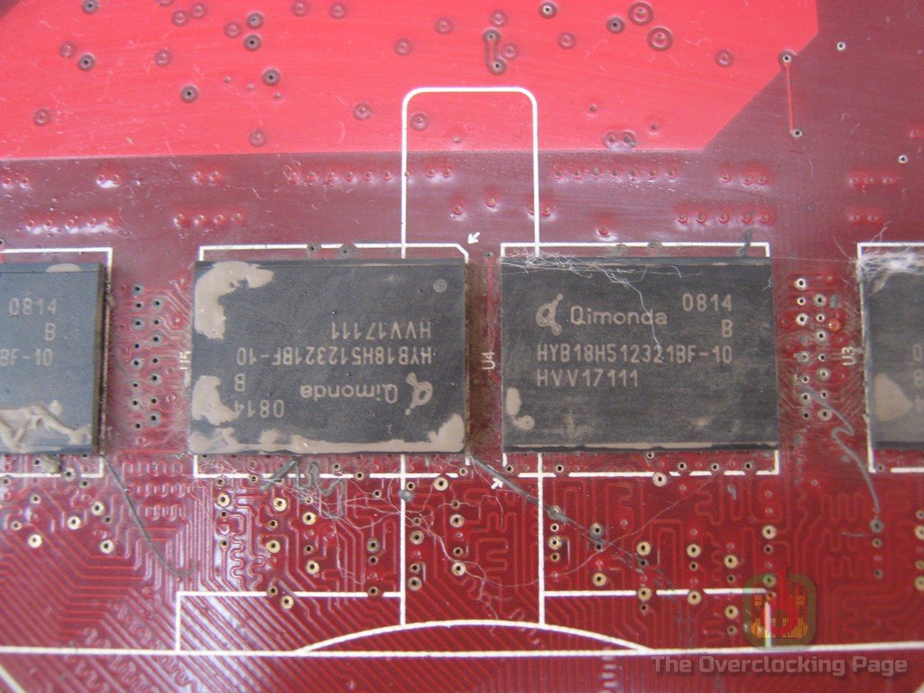 As memórias usadas na placa de referencia são chips GDDR3 1ns (2000MHz efetivos) com tensão padrão de 2V, foram fabricados pela finada Qimonda e como pode-se ver pela foto abaixo, alguns resquícios do thermal pad ainda permaneceram no encapsulamento, mas nada que comprometa no funcionamento ou dissipação de calor. 🙂