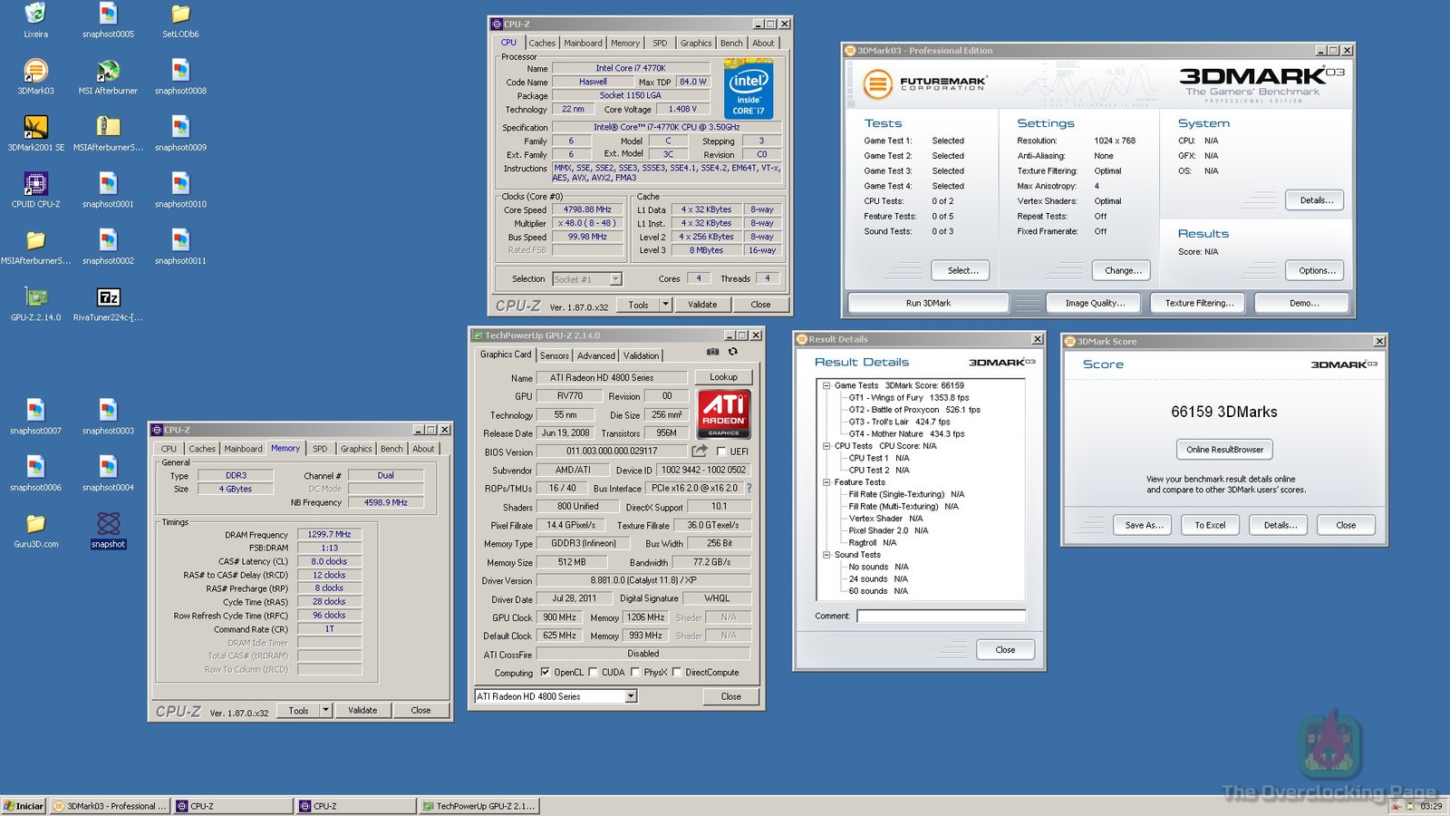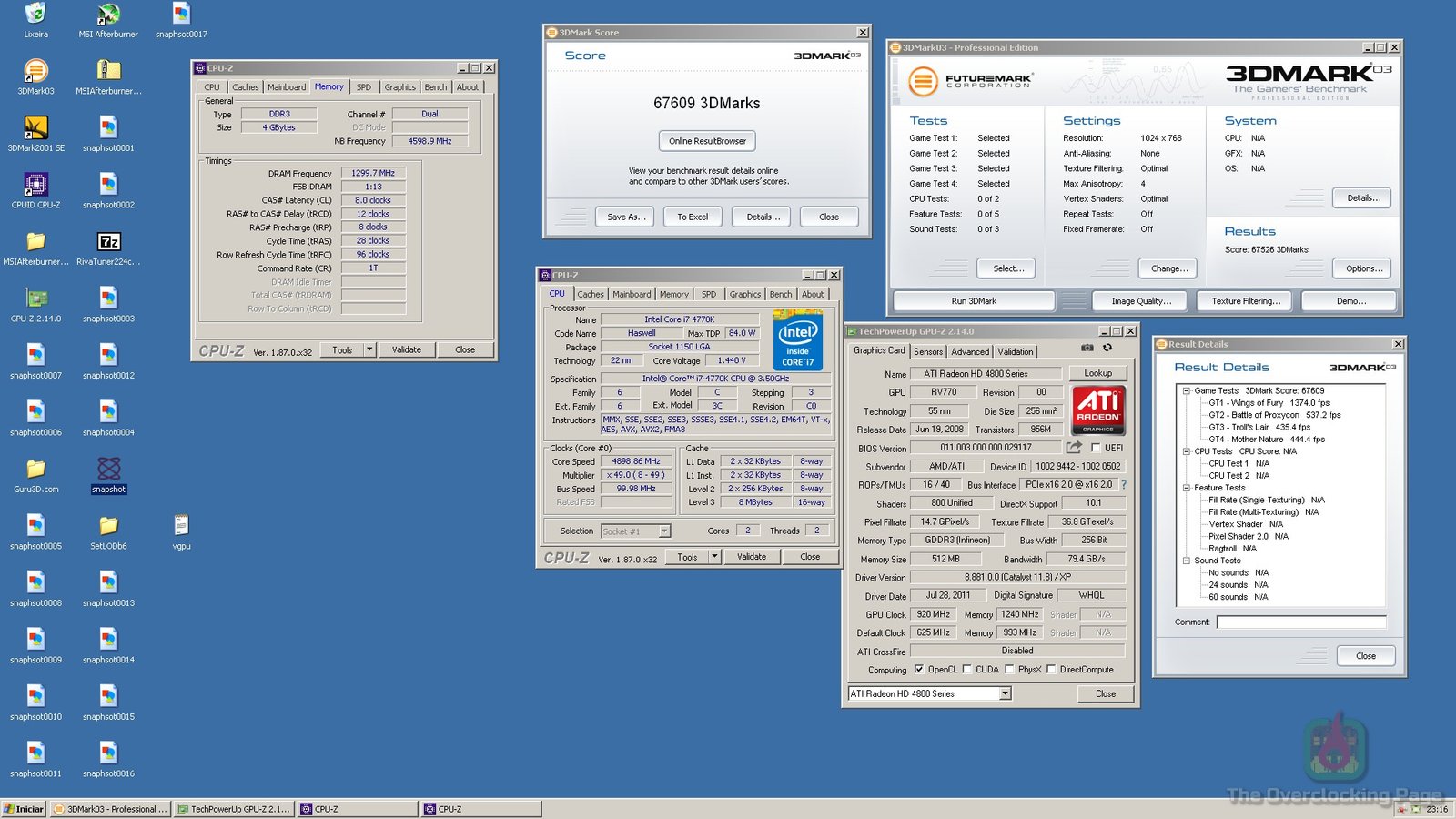 Objetivo dos testes: Extrair o máximo de desempenho da Radeon HD4850 visando obter resultados competitivos no ranking do HWBOT e de quebra mostrar o máximo que é possível tirar da placa com diferentes configurações, tal como mostrar o que as modificações fizeram por nós nesse cenário. Explicações acerca de como os testes foram conduzidos estão contidas nos textos que acompanham os resultados a seguir.