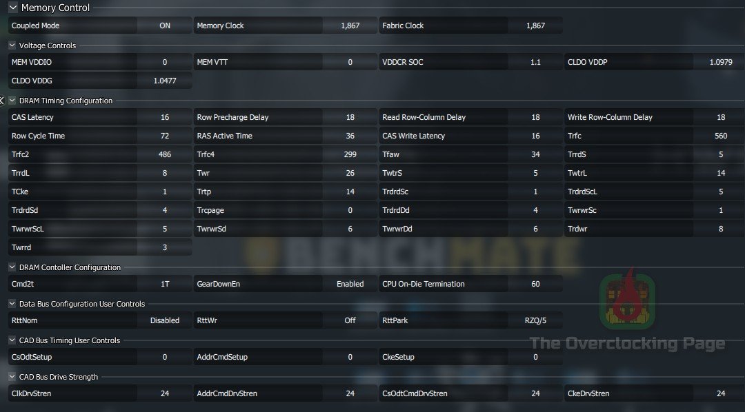 Aqui cheguei a esses dois ajustes distintos, um com RAM @ 3733MHz usando o FCLK e UCLK sincronizados com a memória (1866MHz portanto) e outro @ 4200MHz com FCLK em 1866MHz sendo que para a primeira configuração foi necessário aumentar a tensão das memórias para 1.425V e na segunda 1.475V.