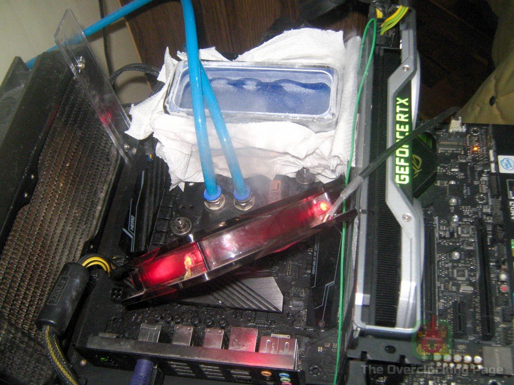 Na foto abaixo, é possível ver o que fiz para isolar a memória e também é necessário deixar bem claro que o que fiz aqui foi uma gambiarra que não recomendo ser feita caso a ideia seja rodar assim por tempo prolongado. O correto seria usar “dissipadores” semelhantes a aqueles que acompanham os waterblocks de memória ou mesmo montar o pot com contato direto nos chips, entretanto, o que fiz foi usar o pot em contato com o dissipador padrão que vem com as memórias, o que está longe do ideal mas ainda “quebra um galho” por conta do fato desses chips de memória dissiparem bem pouco calor.