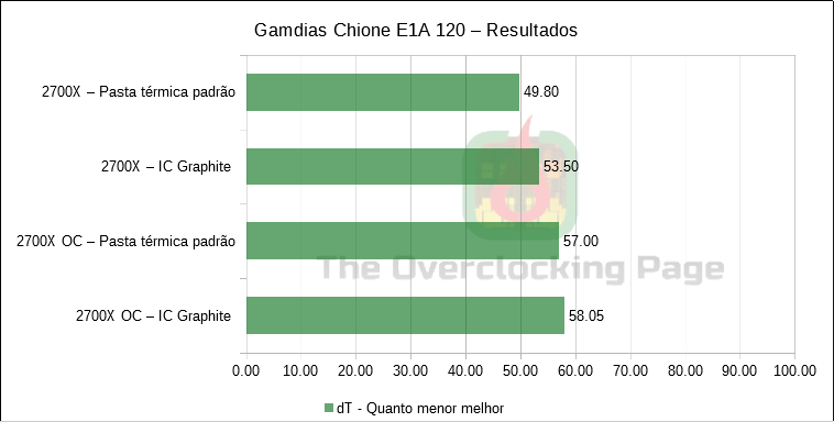 No primeiro gráfico, podemos ver os resultados obtidos com as diferentes configurações de clock e interfaces térmicas, onde houve uma diferença de cerca de 3.7ºC a favor da pasta térmica que acompanha o E1A 120 em relação ao IC Graphite em stock enquanto que com overclock, esse delta se reduziu para 1.05ºC, mas ainda sim, permaneceu favorável a pasta térmica.
