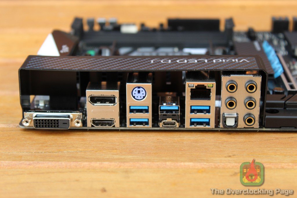 Sobre o espelho traseiro, temos 6 portas USB 3.X (incluindo uma USB-C), uma PS/2, LAN, saídas de vídeo DVI/HDMI/DP e painel de som com 6 conectores, o que considero bastante razoável para uma placa como essa.