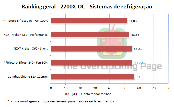 Por fim, no ranking geral, que inclui apenas os resultados para o R7 2700X em OC com todos os sistemas usando a interface térmica que os acompanham (exceções serão marcadas com um ‘*’ ou cor diferente), o NZXT Kraken X62 acabou arrematando a segunda e terceira posição, ficando atrás do Riotoro Bifrost 240mm com seus fans com mais de 5mmH2O de pressão estática, porém, com ruído @ 100% um tanto mais alto que aquele apresentado pelo NZXT.