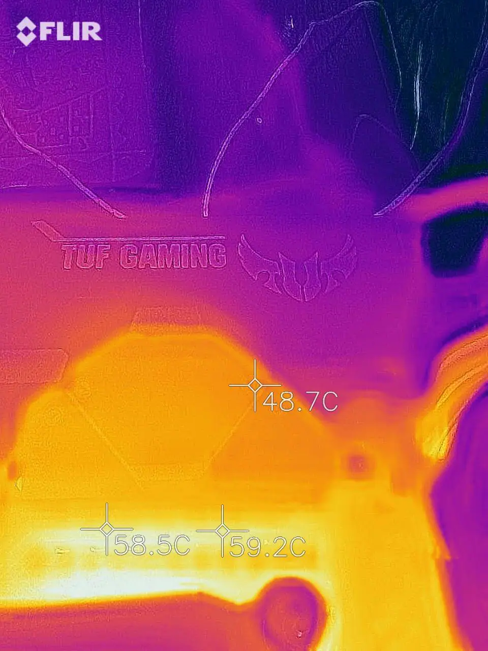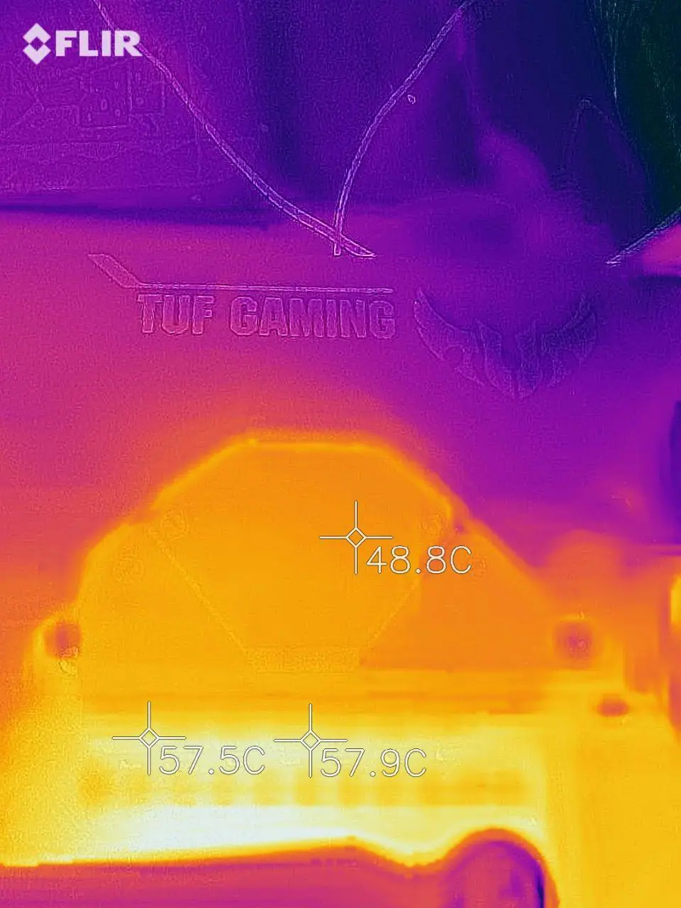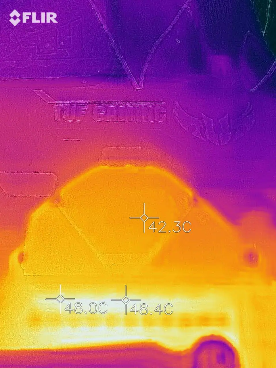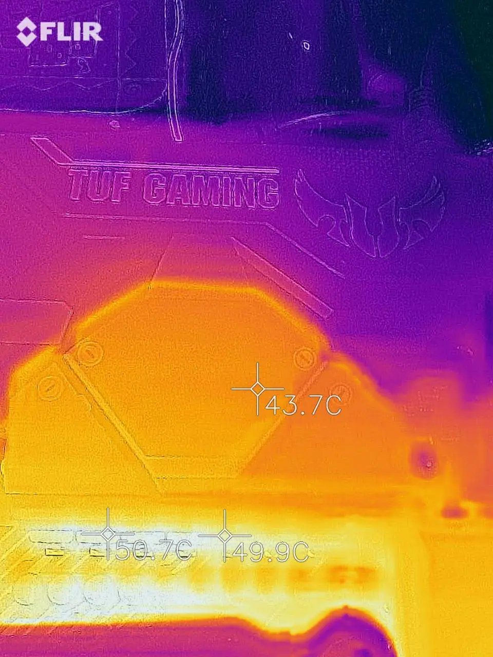 Para verificar a temperatura dos circuitos de alimentação foi usado a FLIR One LT para fazer as termográfias após rodar o stress test do AIDA64, em suas configurações padrão, por 30 minutos enquanto o HWiNFO armazenava o log para posterior verificação. Visando “validar” esses resultados, também foi instalado um termopar com um thermal pad grudento na parte de trás da placa, logo atrás das powerstages das fases localizadas na lateral da placa, próximas ao espelho traseiro, onde desde já adianto que a diferença verificada foi de cerca de 3ºC a menos para a leitura do termopar em relação a FLIR, o que está em linha com aquilo observado nesse artigo.