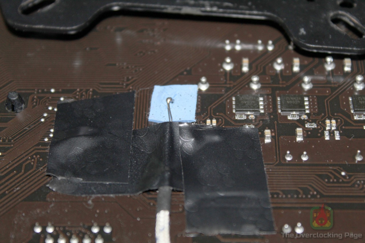 Para verificar a temperatura do VRM, foi instalado um termopar tipo K com um thermalpad grudento diretamente em um dos mosfets de baixa localizados na parte de trás da placa conforme pode ser visto na foto abaixo, contudo, essa placa também possui sensor de temperatura para o VRM, o qual apresentou uma diferença entre 3ºC e 5ºC relativo a leitura do termopar.