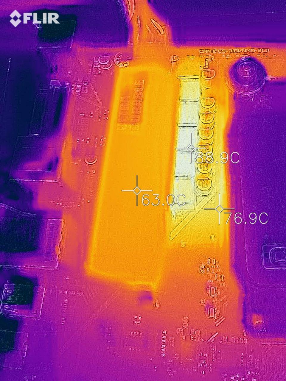 Já relativo ao R7 3800X/XT, a temperatura não excedeu os 82ºC, o que se não é algo brilhante ao menos é razoável e por fim, como já era de se esperar, o R5 3600 não representou dificuldade para esse VRM, que bateu um pico de 64ºC. Por fim, segue as termográfias da região do VRM, onde é possível ver a temperatura do dissipador, dos indutores e do pcb, o qual é o valor que mais se aproxima da temperatura dos mosfets.