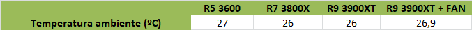 Na tabela abaixo é possível ver a temperatura ambiente ao término do teste em cada uma das situações que foram testadas sendo importante salientar que esses testes foram realizados em bancada aberta e que a “temperatura ambiente” dentro de um gabinete costuma ser algo maior, a depender do hardware utilizado, projeto de ventilação do case e da própria temperatura ambiente da sala onde o computador está localizado.