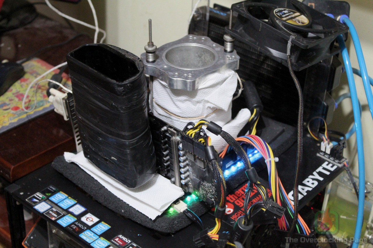 O isolamento das peças foi feito com ‘plastidip’ e o processo de aplicação, ou ao menos uma foto dele, pode ser vista nesse artigo. Também foi adicionado papel toalha ao redor do socket, memórias, parte traseira da VGA e outras partes sensíveis, afinal de contas, ainda existe condensação e a água pode acabar indo para lugares onde ela não seria muito bem-vinda, como, por exemplo, contatos e slots. Um adendo importante é que a GPU em questão é a ASRock RX5700 XT Challenger, a mesma que já fiz o review e testes usando gelo seco, como é notório a todos que acompanham esse meio, em muito breve a AMD deve lançar as GPUs RDNA2, portanto, dá para considerar esse artigo como uma espécie de “despedida” da RDNA.