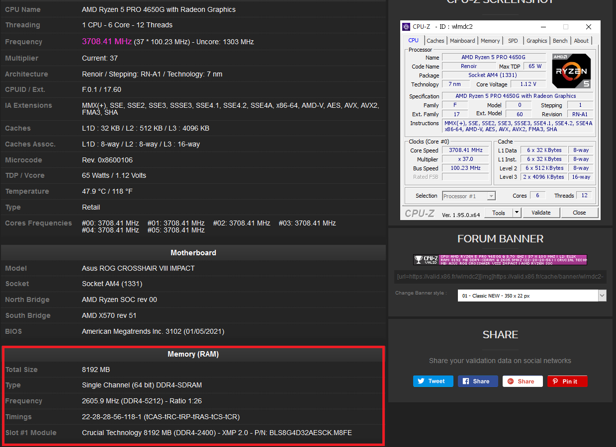 1. O processo de 7 nm realmente fez a diferença naquilo que diz respeito a capacidade de overclock da memória e do IF em relação às contrapartes sem vídeo integrado, baseadas no IO Die em 12 nm, no caso, o 4650G foi capaz de validar 5212MHz na Micron E-Die, marca um pouco melhor do que aquela obtida com o R7 5800X usando LN2 na memória. Sobre a frequência máxima do IF, o chamado FCLK, ele varia conforme a qualidade da amostra, memória utilizada e se o vídeo integrado está ativado ou não, no caso, com esse ultimo ligado, foi possível atingir 3933/1966 usando Samsung B-Die “Dual Rank”, 4133/2066 com Samsung B-Die “Single Rank” PCB A0 e 4400/2200 com Micron E-Die “Single Rank”.