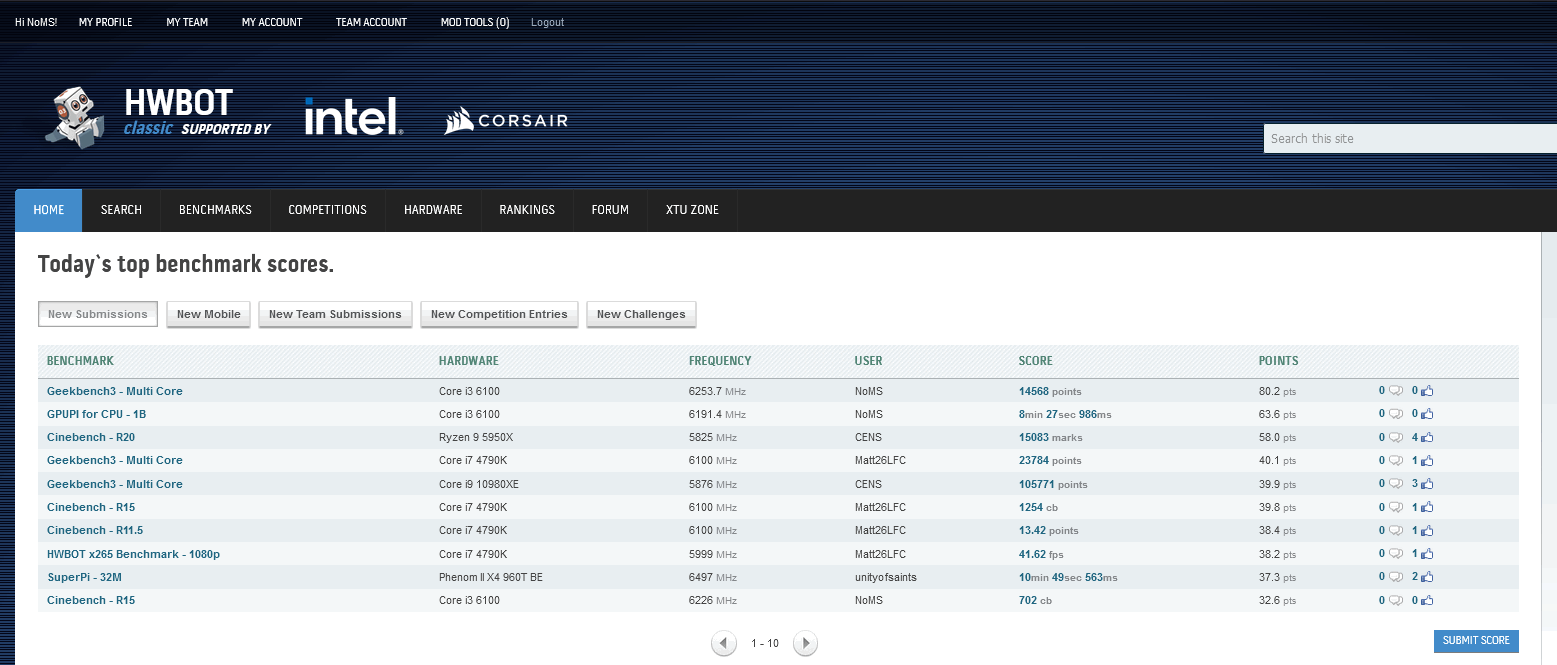 Sobre os resultados no HWBOT, os 702cb no Cinebench R15 foram bons para pegar o 2.º lugar na categoria do i3 6100, enquanto o Geekbench 3 ficou em 4.º lugar e por fim, o GPUPI 1B 3.2 ficou na sétima posição.