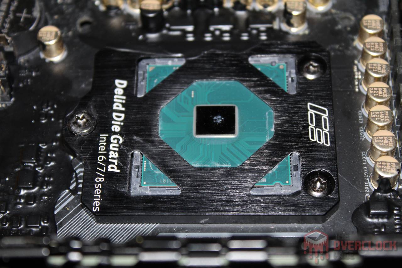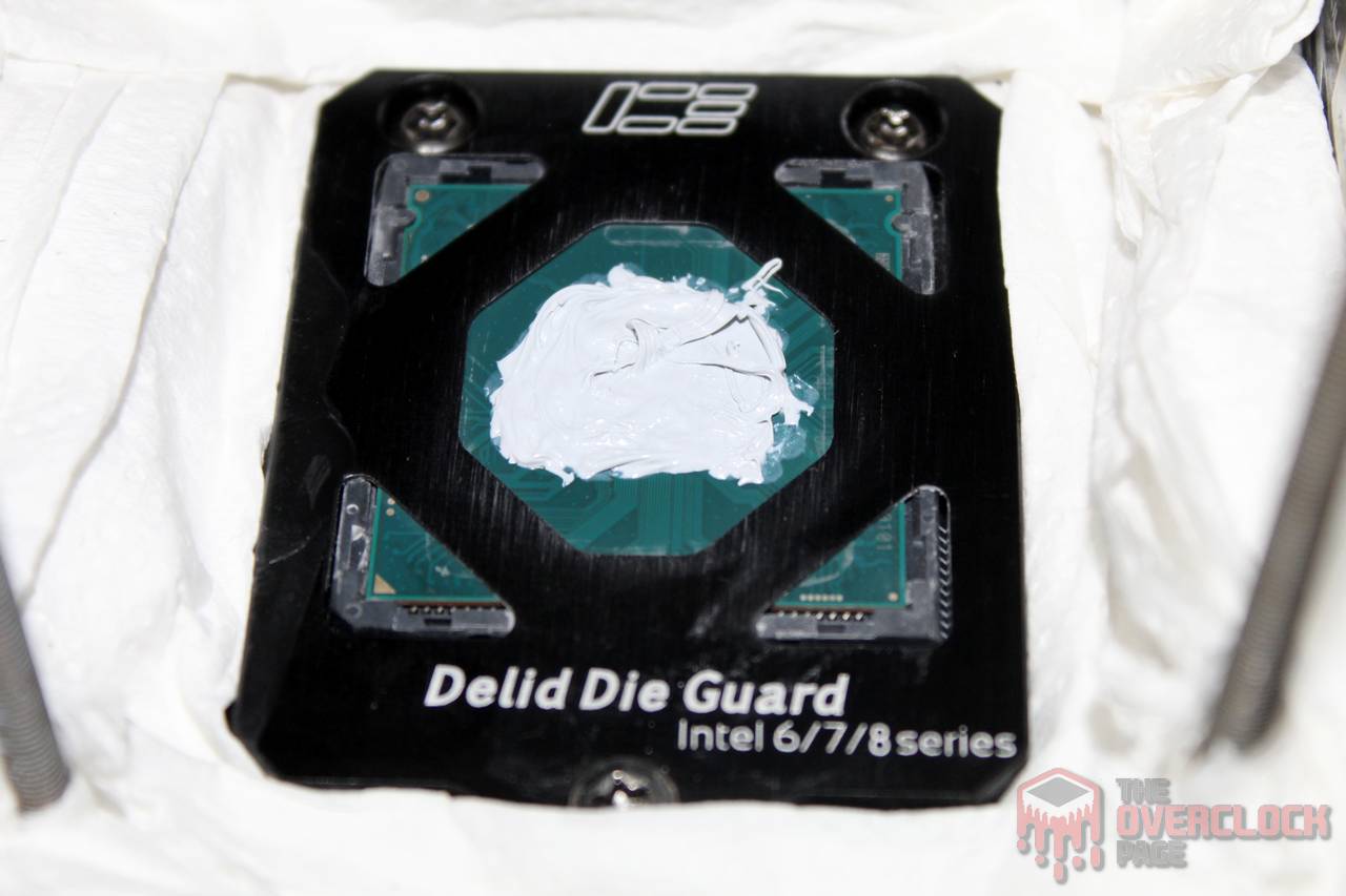 Diferentemente do que foi feito na primeira vez, dessa vez o pot foi montado em um esquema “direct die” usando um ICE Delid Die Guard, que funcionou perfeitamente para o propósito.