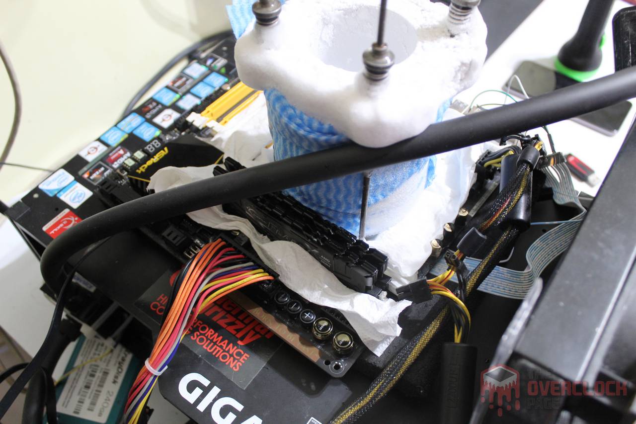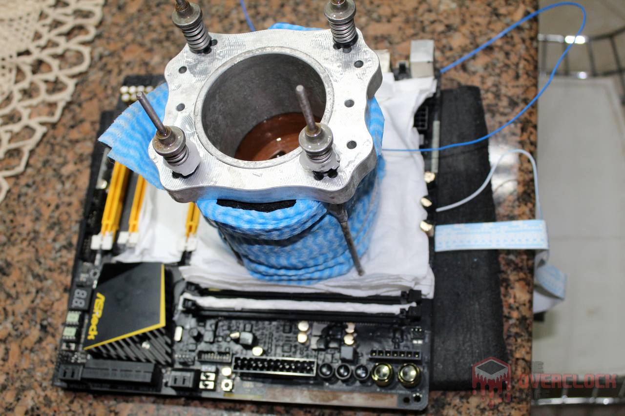 A pasta térmica escolhida foi a Thermal Grizzly Kryonaut, onde a CPU foi “rebocado” com uma quantidade de pasta bem além do que o normal, cobrindo até mesmo parte do encapsulamento, o que confere maior resistência a trincas na pasta enquanto estiver trabalhando com temperaturas na casa dos -190?°C com a CPU em carga.