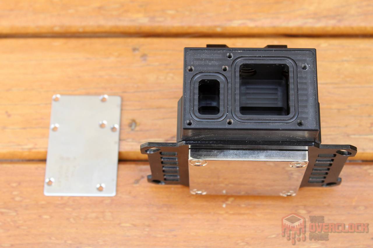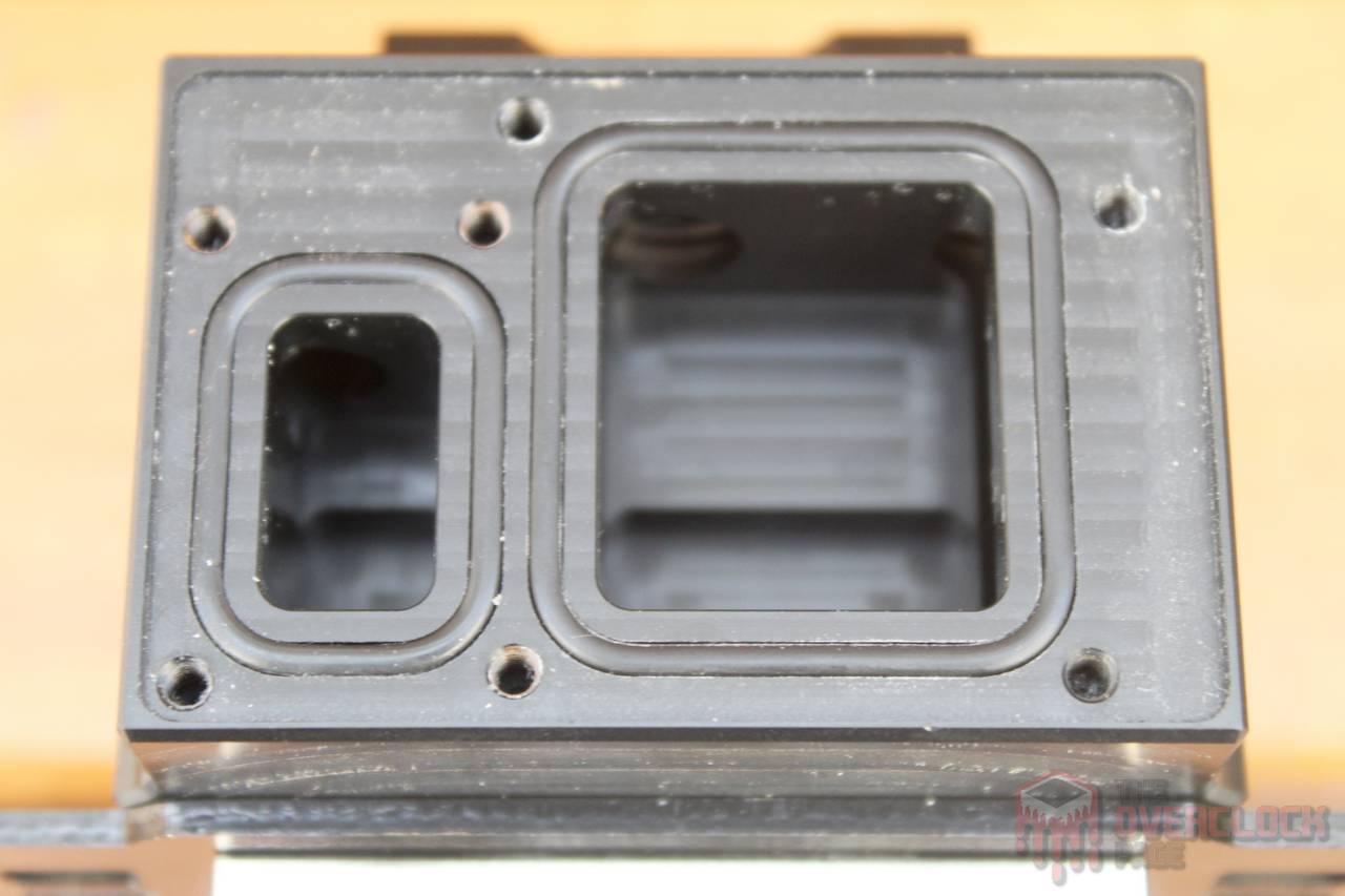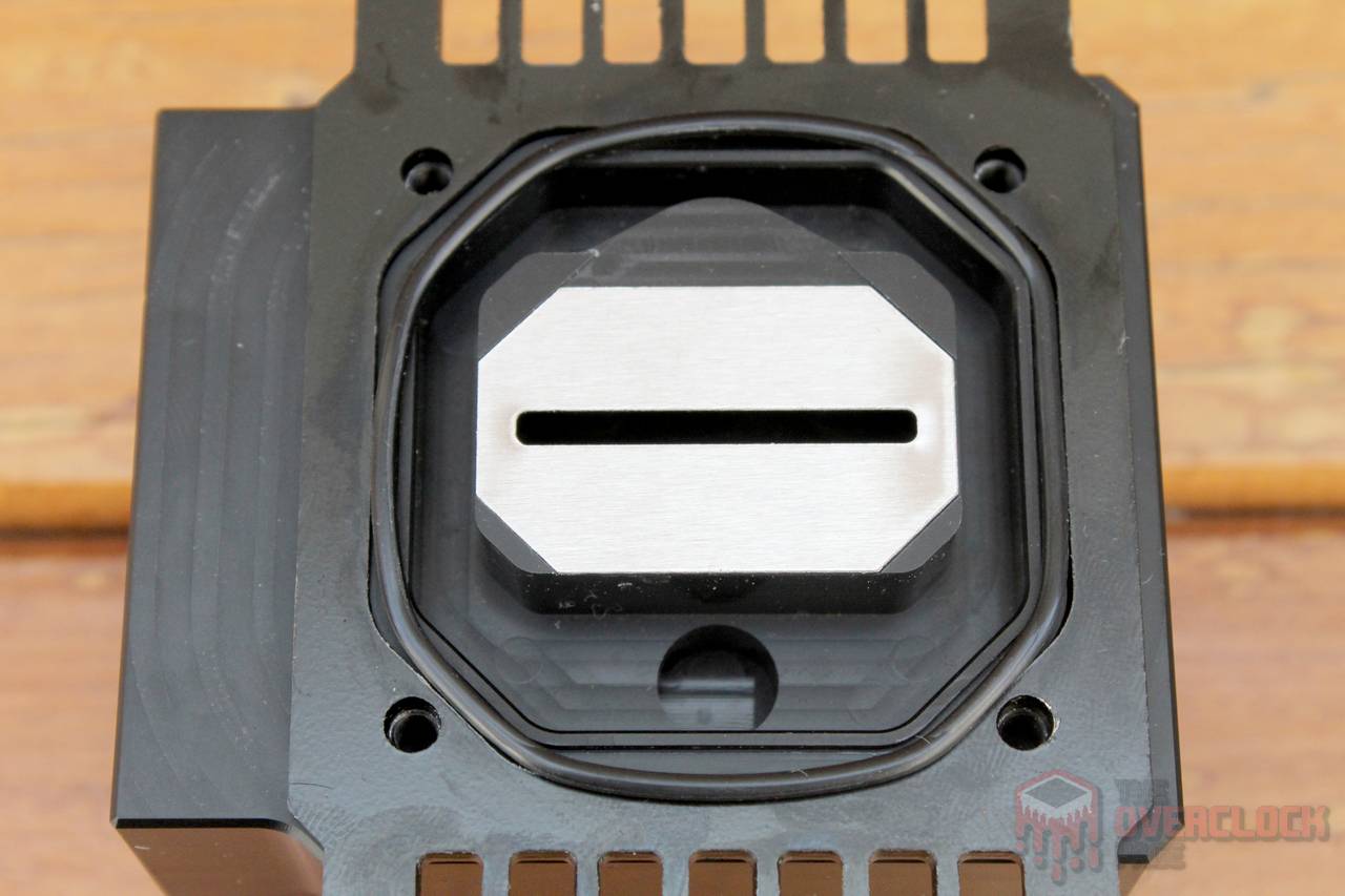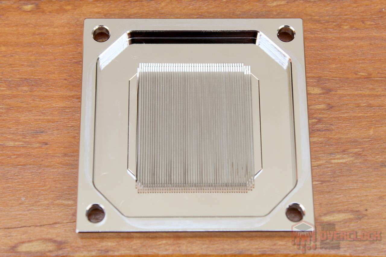 Ao desmontar a parte de baixo, temos base do bloco, que possui uma estrutura interna com 49 microcanais e “jet plate”, responsável por controlar o fluxo de fluido pelos canais, resultando em diferentes padrões de circulação a depender do seu formato, o que pode resultar em melhor desempenho do bloco, afinal, diferentes CPUs podem possuir “dies” com dimensões distintas, usar vários “dies”no caso de chiplets ou ter IHS com formato diferenciado, então, ao menos em tese, é possível ter uma “jet plate” otimizada especificamente para cada um desses processadores, conforme as suas características.