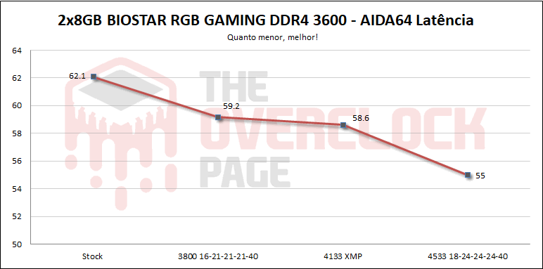 As Biostar RGB DDR4 Gaming X 3600 apresentaram boa compatibilidade com a plataforma AMD, funcionando normalmente com XMP, onde ao se fazer overclock com esse ajuste, foi possível obter estabilidade em 4133MHz apenas aumentando a tensão das memórias para 1.5V, o que é uma ótima marca, especialmente considerando o mínimo esforço empreendido para se chegar nesse resultado