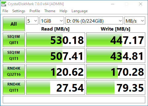 - Crystalmark 7.0.0 x64: Esse benchmark usa dados aleatórios, faz testes de leitura/escrita sequenciais e em blocos de até 4 KB. Também é importante frisar que os resultados aqui apresentados não são de todo comparáveis com as versões anteriores do Crystalmark, o que exige cautela na hora de se fazer comparações.