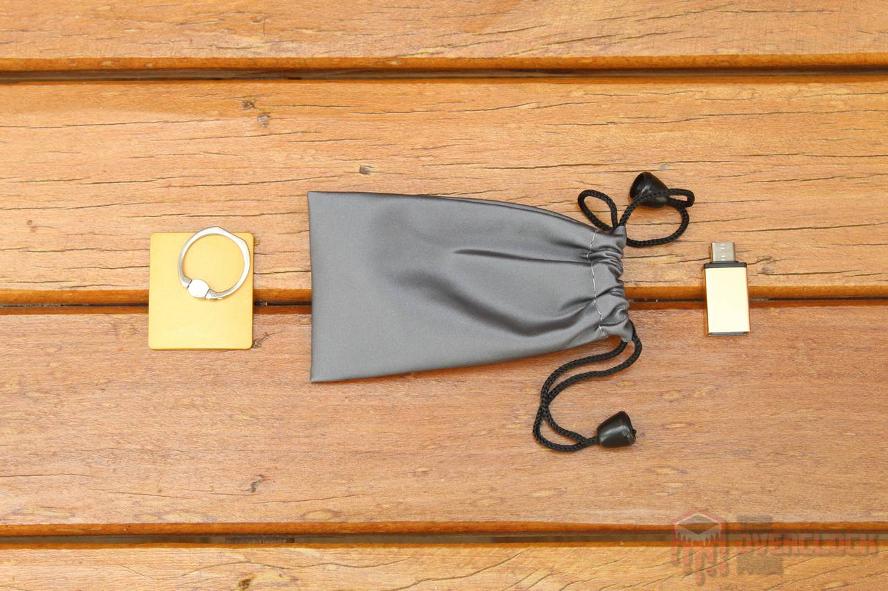 Além do SSD, o fabricante também envia um saquinho contendo brindes, no caso, um adaptador USB-C para USB 3.0 e uma base com cola e uma argola.