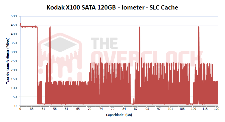 ..Já no Iometer, é possível ver que o “SLC Cache” cobriu cerca de 49 GB, apresentando desempenho máximo nessa situação, com uma taxa de transferência de cerca de 440 MB/s, apresentando uma média de aproximadamente 60 MB/s após esgotar o “SLC Cache”, novamente, um resultado digno se considerarmos as especificações do modelo.