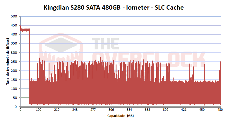 …Por outro lado, no Iometer, é possível ver que o “SLC Cache” cobriu 176 GB, entregando desempenho máximo nessa situação, com uma taxa de transferência de cerca de 430 MB/s, apresentando média de 34,8 MB/s de média na velocidade nativa, ou seja, aquela que ocorre dos 176 GB até os 480 GB, sem o benefício do SLC Cache.