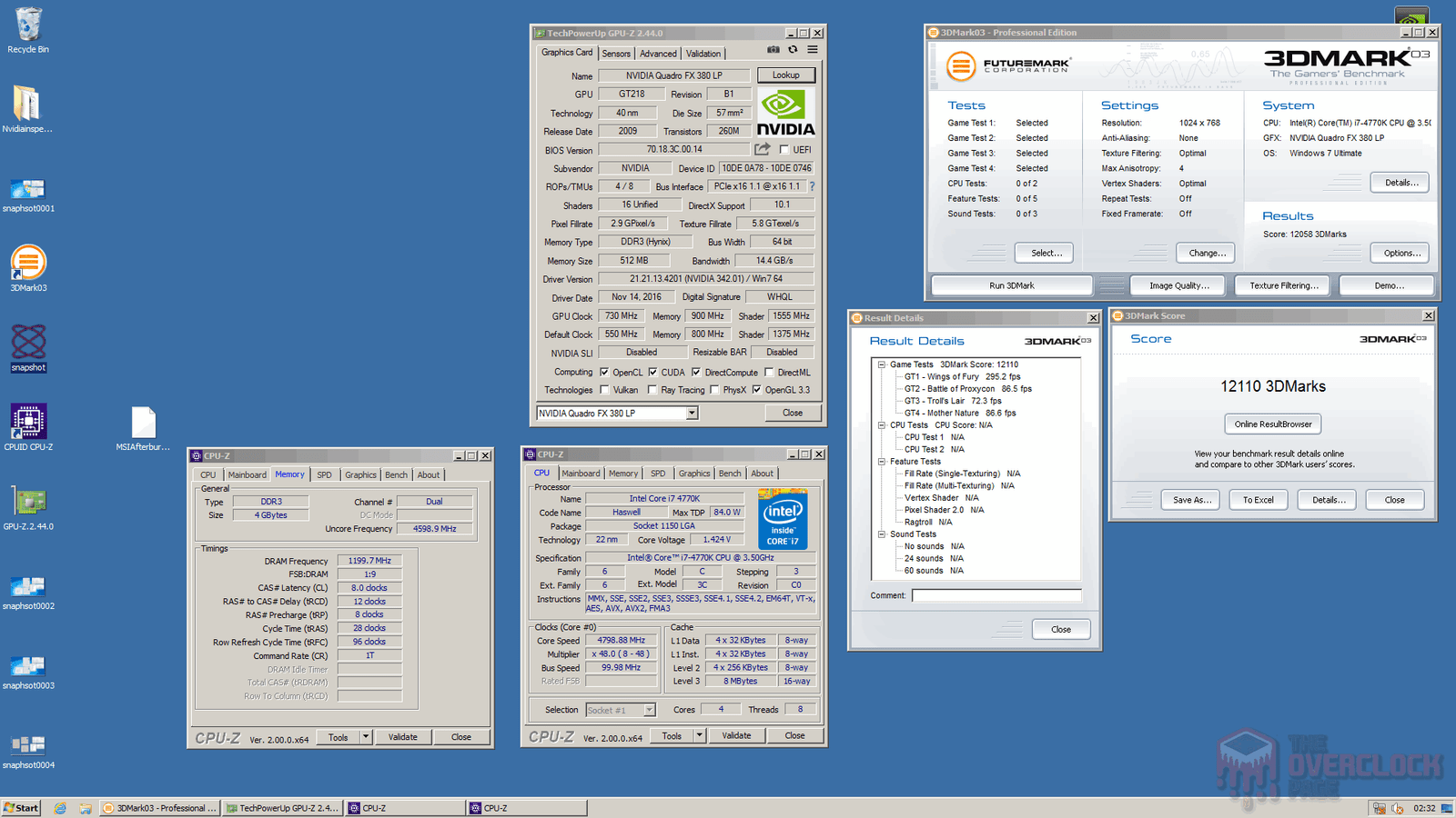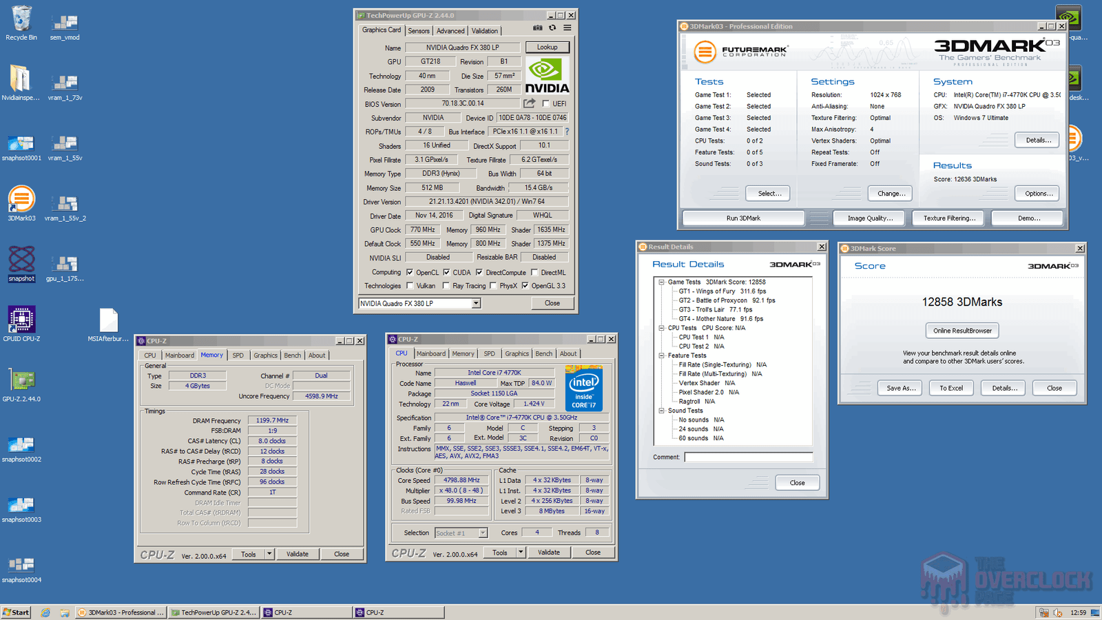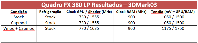 Objetivo dos testes: Explorar os limites da Quadro FX 380 LP antes e após as modificações, assim como os ganhos obtidos com cada uma das modificações. Mais detalhes a respeito dos testes se encontram nos textos a seguir.