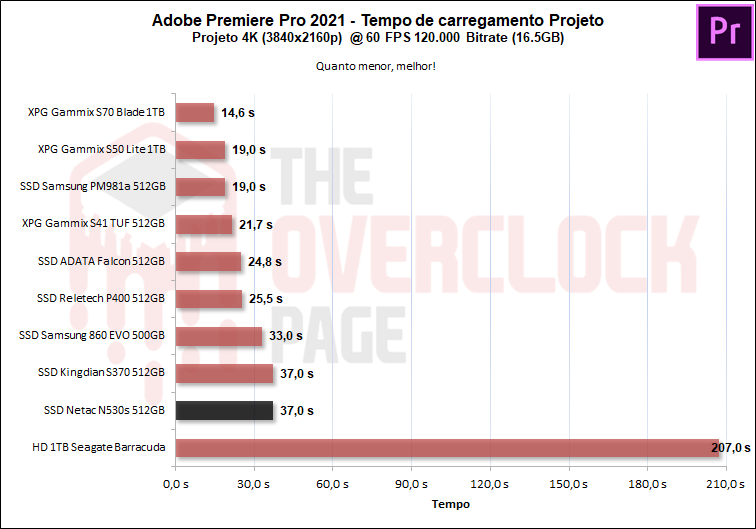 A seguir, utilizamos o Adobe Premiere para medir o tempo médio de abertura de um projeto de cerca de 16.5GB com resolução 4K 120Mbps cheio de efeitos até que estivesse pronto para edição. Ressaltando apenas que o SSD testado é sempre como drive secundário sem o sistema operacional instalado, pois isso poderia afetar o resultado e gerar inconsistências.