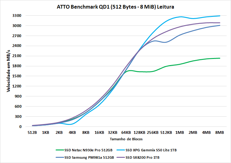 Realizamos um teste utilizando o ATTO para observar a velocidade dos SSDs em determinados tamanhos de blocos diferentes.