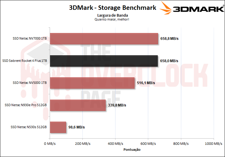 Neste novo benchmark recentemente lançado para o 3DMark, vemos que o Sabrent apresentou ótimos resultados alcançando o primeiro lugar do comparativo em empate técnico com o NV7000.
