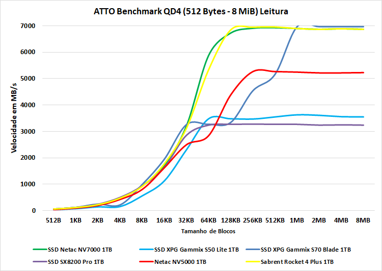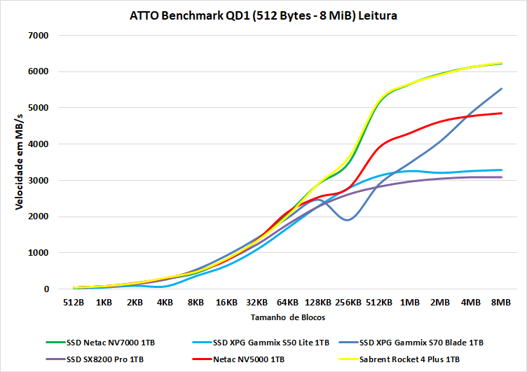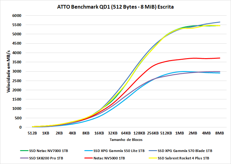Realizamos um teste utilizando o ATTO para observar a velocidade dos SSDs em determinados tamanhos de blocos diferentes. Neste benchmark, foi configurado da seguinte forma: