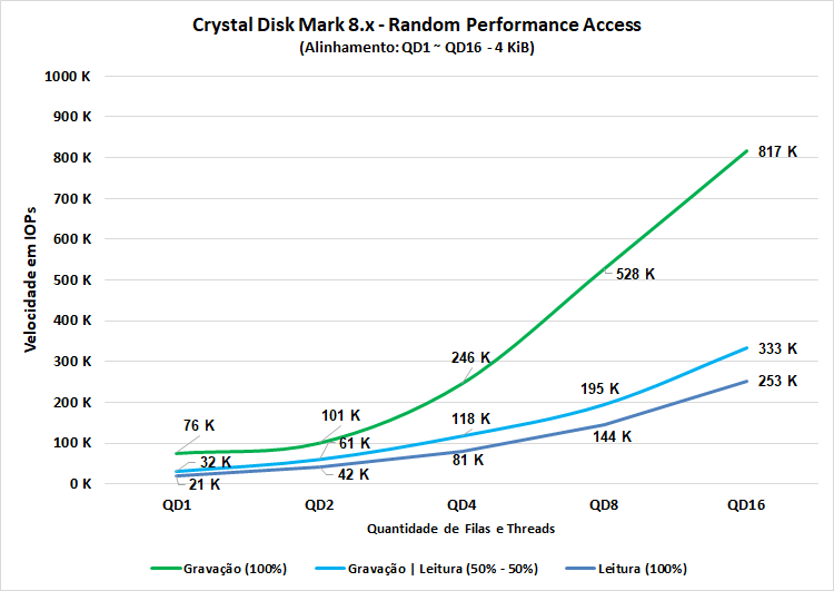 Neste teste que realizamos acima, foi realizado 3 configurações de acessos entre diversas configurações de queue depth desde QD1 que represente um uso cotidiano do dia a dia, quanto QD16 que já se torna bem surreal, mais comparável com ambientes virtualizados.