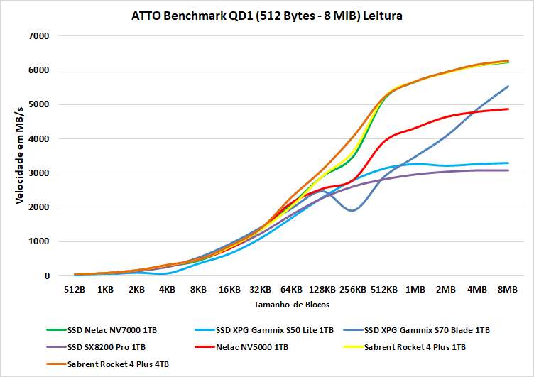 Como podemos observar nos gráficos de velocidade sequenciais acima, ambos os NV7000 e os Sabrent ficam muito próximos um dos outros.