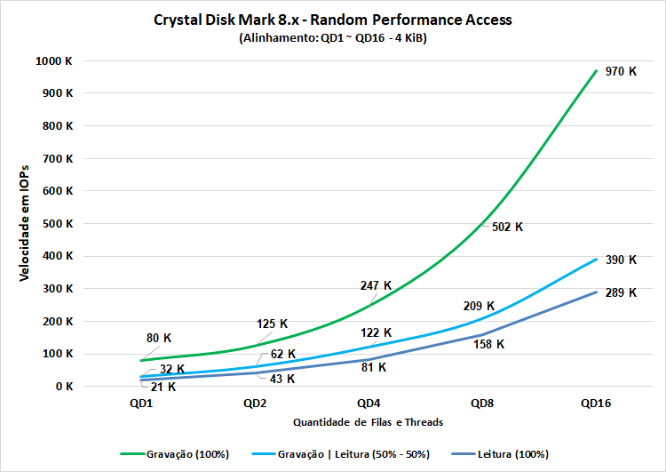 Neste teste que realizamos acima, foram utilizadas 3 configurações de acessos entre diversas configurações de queue depth desde QD1 que represente um uso cotidiano do dia a dia, quanto QD16 que já se torna bem surreal, mais comparável com ambientes virtualizados.