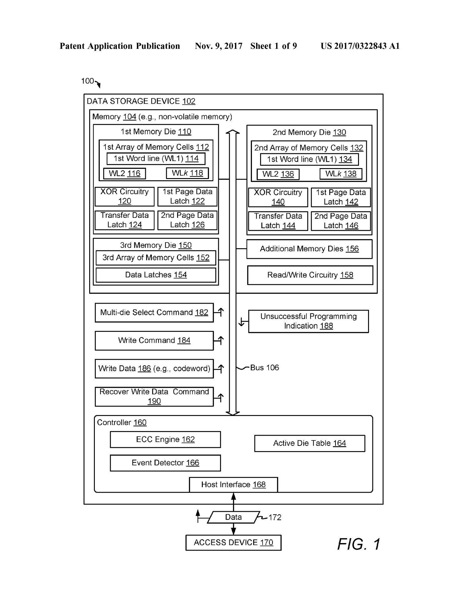 Neste exemplo, em resposta para o comando MDS (182), o Transfer data latch (144) do segundo die pode ser ativado para receber os dados de escrita (186), mesmo que o comando de escrita (184) esteja associado com os dados de escrita (186) não se identifiquem como local de acesso para escrita no segundo die (130)