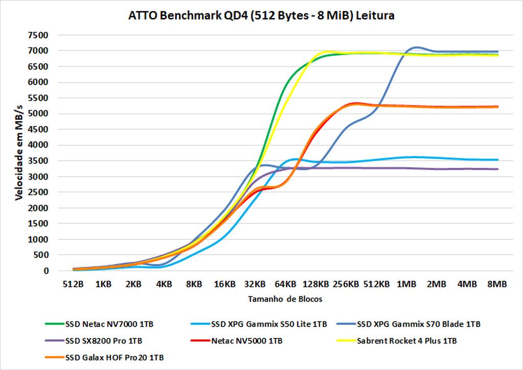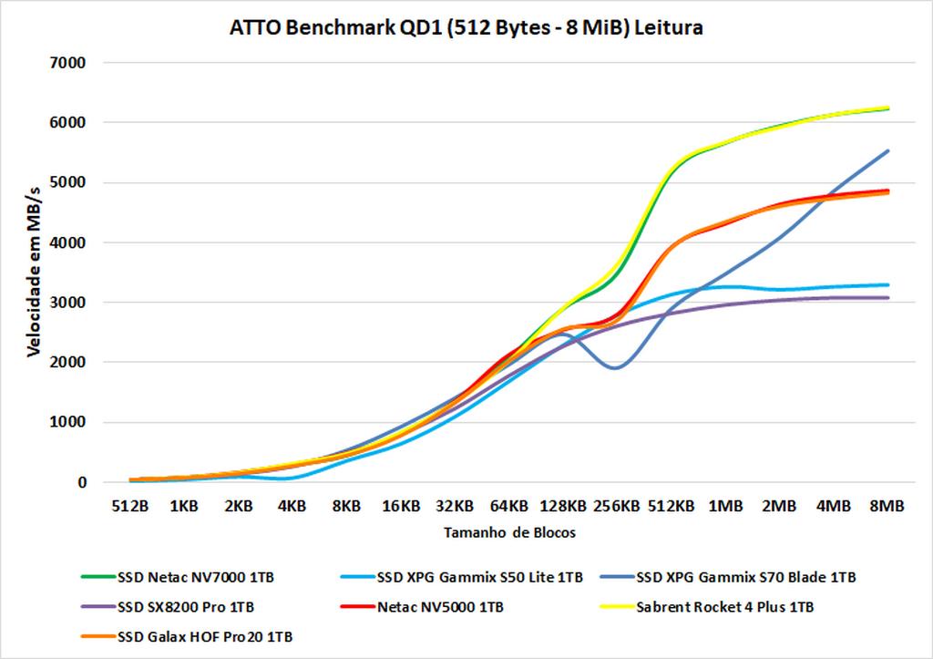 O ATTO disk benchmark é um software que faz um teste de velocidade sequencial com arquivos comprimidos, ou seja, para uma simulação em uma carga de transferência de dados como no windows, geralmente vemos algo em torno dos blocos de 128KB à 1 MiB, agora vemos que em blocos de menor tamanho ele ficou junto dos demais SSDs, apenas quando os blocos foram aumentando que foi possível constatar que ele basicamente se comporta de forma idêntica ao NV5000.