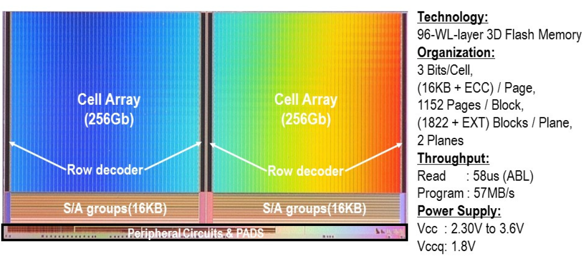Como podemos observar no diagrama de seus Dies BiCS4 512Gb a Kioxia os classifica como capazes de entregar até 57 MB/s por cada die usando 2 planes de 256Gb cada. Neste caso estes dies de 256Gb são exatamente iguais a este de 512Gb contendo apenas uma menor quantidade de blocos por cada plane, aonde cada plane tem um tamanho de 128Gb. E com isso seu throughput consegue ser levemente superior.