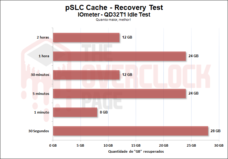 Realizamos também um teste para ver quanto tempo o SSD levaria para recuperar parte de seu Buffer e, no decorrer da nossa bateria de testes, que vai de 30 segundos até 2 horas em idle. E durante este período vemos que em até menos de 30 segundos ele recupera seu volume inteiro de pSLC Cache o que é um resultado incrível.