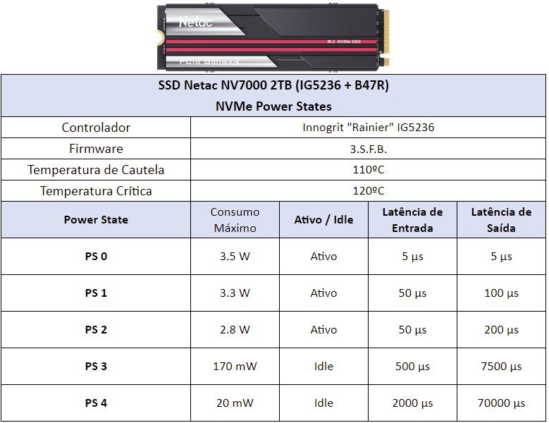 Vemos que a fabricante já informa de forma errônea os primeiros power states do SSD, levando em conta que em seu powerstate PS0, o SSD conseguiu puxar mais de 7.6 W, sendo que a Netac afirma 3.5W, ou seja, menos da metade. Isso ocorreu também no SSD Asgard AN4 de 1TB que testamos recentemente também.