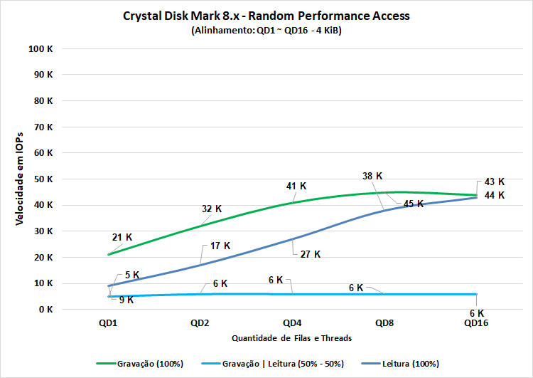 Aleatórios: 2x 1 GiB (Blocos 4 KiB) 1 Queue 1/2/4/8/16 Threads