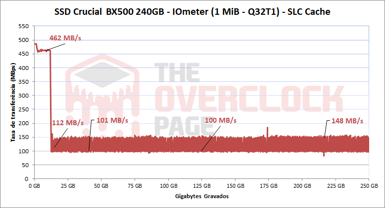Através do IOmeter, podemos ter uma ideia do volume de SLC cache deste SSD, já que o fabricante muita vezes não informa este valor. Pelos testes que realizamos, foi possível constatar que a unidade de 240GB possui um volume de pSLC Cache dinâmico, cerca de 12GB, que conseguiu manter velocidade média de ~ 465 MB/s até o fim do buffer, o que foi um ótimo resultado. Enquanto isso a unidade com de 500GB, teve um volume de aproximadamente 45GB, que manteve a velocidade de pSLC Cache em média de 460 MB/s.