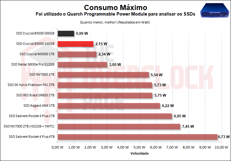 Já, ao monitorarmos seu consumo máximo, vemos que o BX500 de 500GB teve um incrível resultado inferior a 1W, o que é muito bom, sendo que a unidade de 240GB teve um resultado 2x maior, mas ainda sim foi um consumo menor do que outros SSDs SATA.