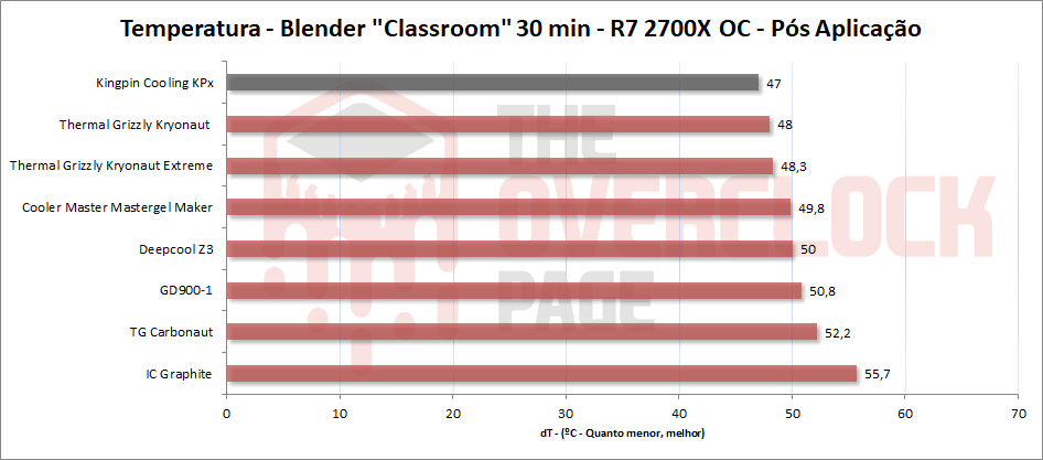 A Kingpin Cooling KPx acabou dominando o comparativo, ficando no topo tanto no pós-aplicação quanto após o tempo de cura com uma vantagem de 1?°C e 1,7?°C, respectivamente, não apresentando diferença significativa no desempenho após alguns ciclos térmicos