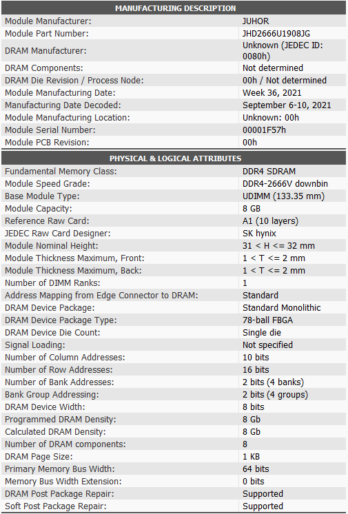 Juhor does not provide an identifier of DRAM Manufacturer in SPD. This is why Thaiphoon Burner did not detect the manufacturer. Anyway, according to the lot number starting “AP1” on the DRAMs, they are produced by CXMT, A-die.
